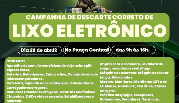 Hoje, quarta-feira, 22 de abril, na Praça Central, das 9h às 16h, será realizada a coleta de diversos equipamentos eletrônicos e eletrodomésticos que não têm mais utilidade. A iniciativa tem como objetivo garantir o destino adequado desses materiais, evitando danos ao meio ambiente e contribuindo para uma cidade mais limpa, sustentável e consciente.